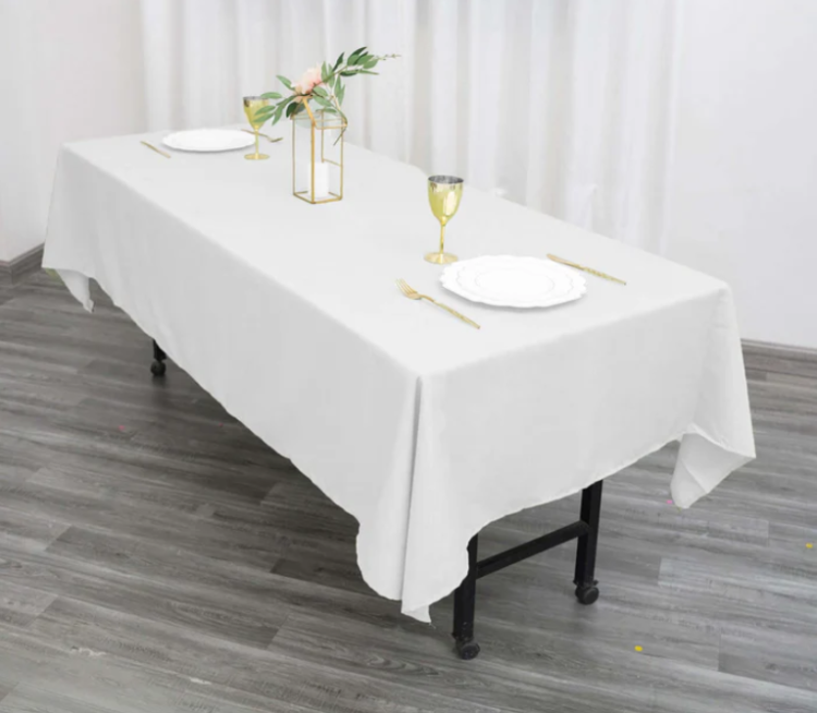 A crisp, white rectangular tablecloth sized to fit a banquet table. Made to cover the tabletop cleanly and hang evenly on all sides, it creates a neat, formal look for weddings, dinners, meetings, or any event that calls for a polished presentation. The neutral white color pairs easily with centerpieces, runners, or place settings and helps brighten a room while concealing scratches or marks on the table surface. Lightweight and easy to drape, it’s a simple, dependable way to give rented or on-site tables a finished, coordinated appearance.